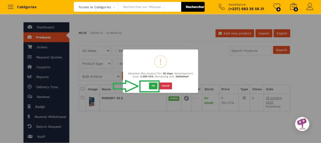 Quand vos articles sont à la une sur MIASSAR, ils s’affichent sur toutes les pages de la marketplace. Ceci vous permet de faire la publicité de vos articles, de gagner en visibilité et de booster plus facilement votre chiffre d’affaire.