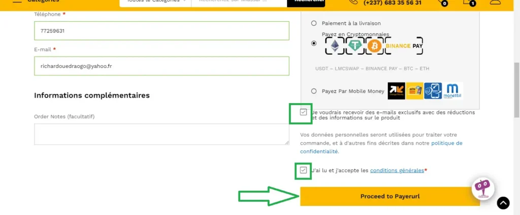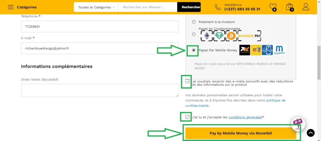 Cochez les cases à cocher et cliquez enfin sur Pay by Mobile via Monetbil