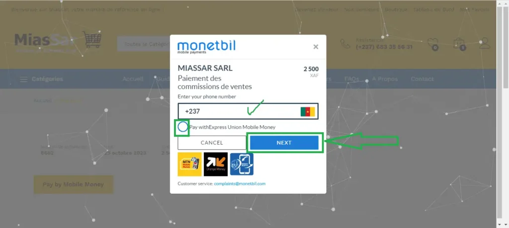 Renseignez votre numéro Orange Money ou MTN Mobile Money. Si vous souhaitez payer par Express Union Mobile, cliquez sur le bouton radio devant Pay with express union mobile. Cliquez sur Next. Mettez votre code mobile money pour valider le paiement.
