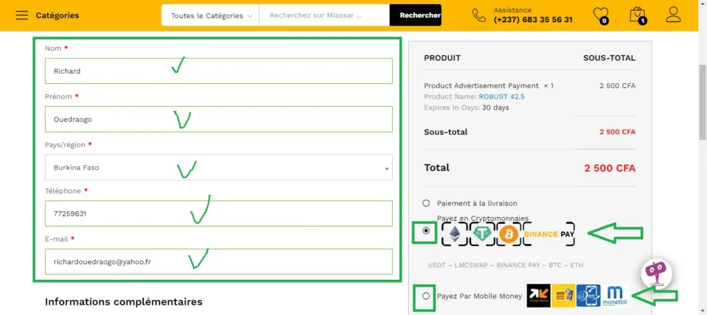Après avoir rempli votre adresse de facturation, cliquez sur « Payez par Mobile Money »