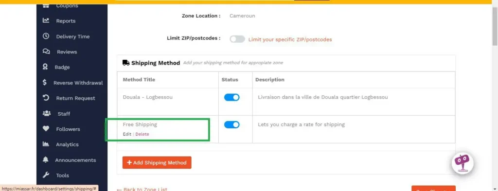 Refaites de même puis cliquez sur expédition gratuite. Nous verrons comment modifier ces deux types de livraisons.