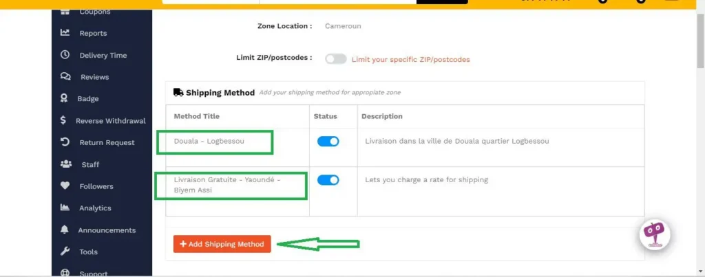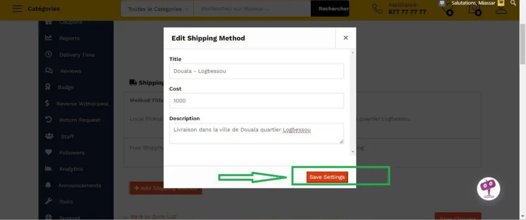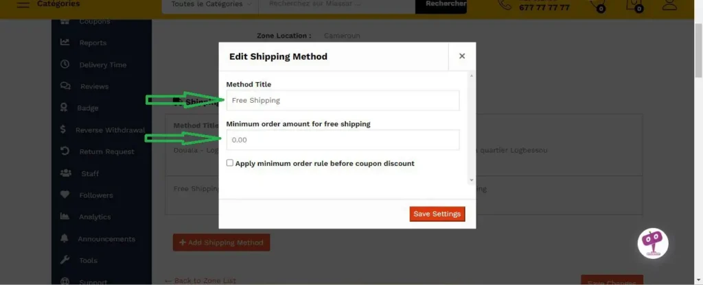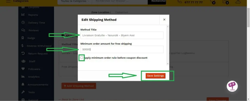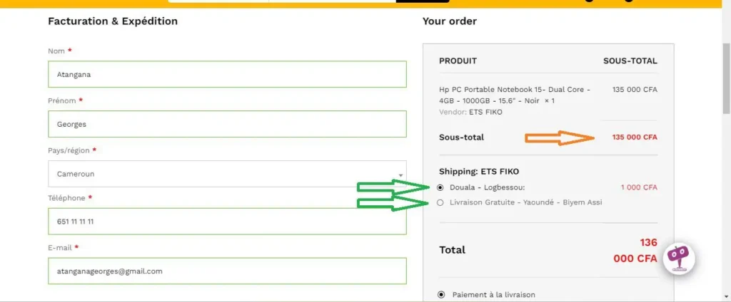 Dans cette exemple. Nous avons ajouté la livraison gratuite pour Yaoundé quartier Biyem-Assi