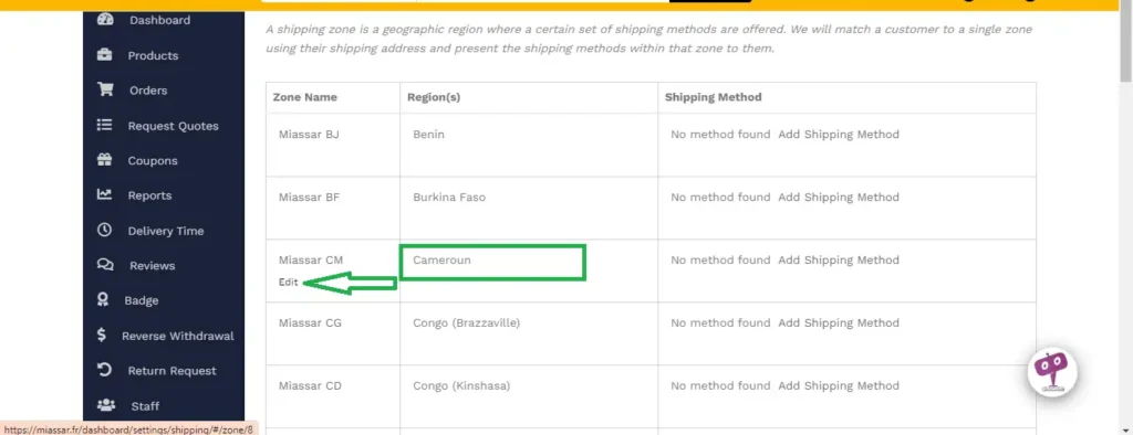 Une fois votre pays trouvé, cliquez sur éditer pour pouvoir ajouter vos villes et quartiers de livraisons.