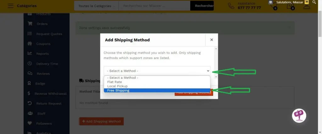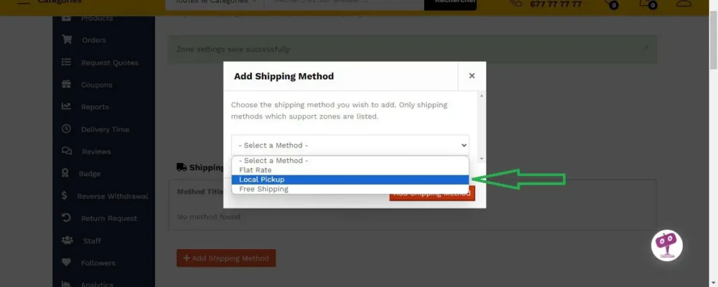 Dérouler le menu pour sélectionner une option. Il y’en a trois (03). Livraison Locale permet d’ajouter les villes et quartiers. Livraison gratuite permet ne facturer une livraison sans payer les frais pour tout achat ou pour des achats d’un certains montants que vous définissez.