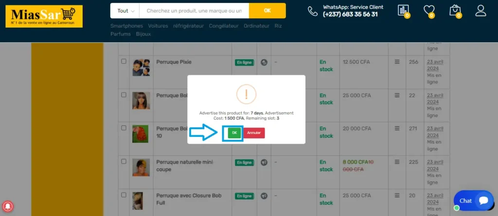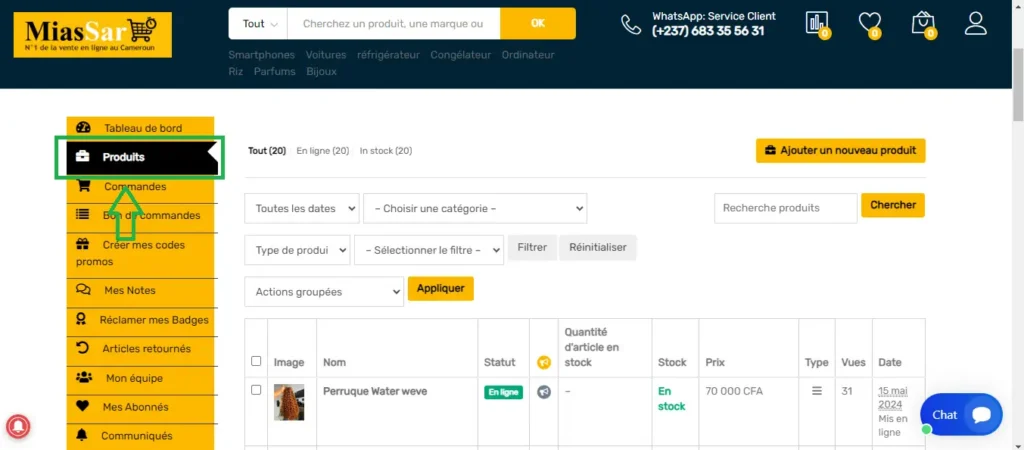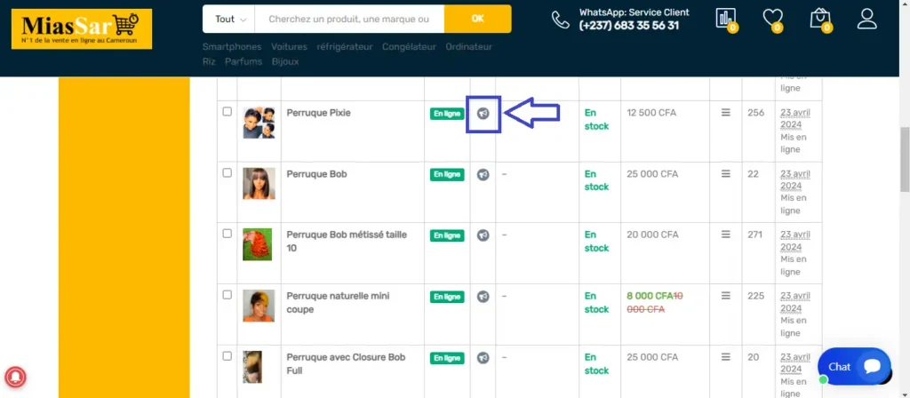 Mettre un produit en vente à la une sur Miassar Cameroun est un excellent moyen d’accroître la visibilité de vos articles et de booster vos ventes. Avec un investissement modeste de 1 500 FCFA, vous pouvez mettre en avant jusqu’à 3 produits pendant 7 jours chacun. N’hésitez pas à tirer parti de cette fonctionnalité pour maximiser vos opportunités de vente sur la plateforme !